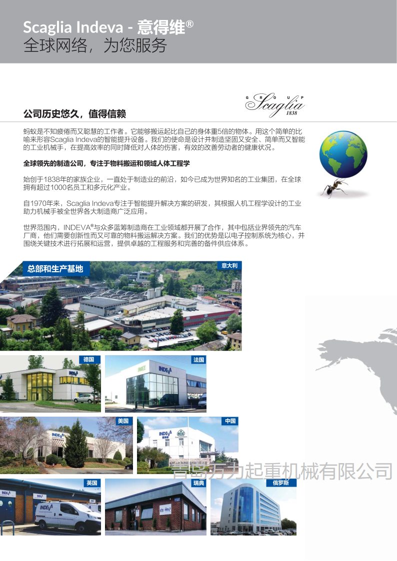 1、Scaglia集團(tuán)成立于1838年,專(zhuān)注于物料搬運(yùn)及工業(yè)操縱器,INDEVA1975年開(kāi)始開(kāi)發(fā)和生產(chǎn)了世界上第一臺(tái)電子智能助力機(jī)械手。